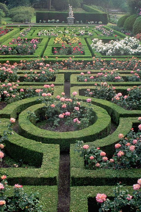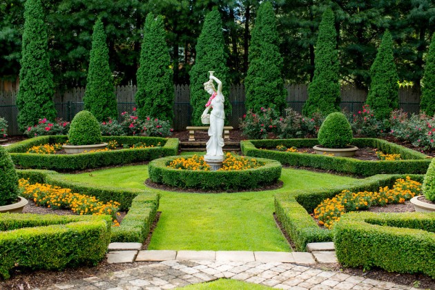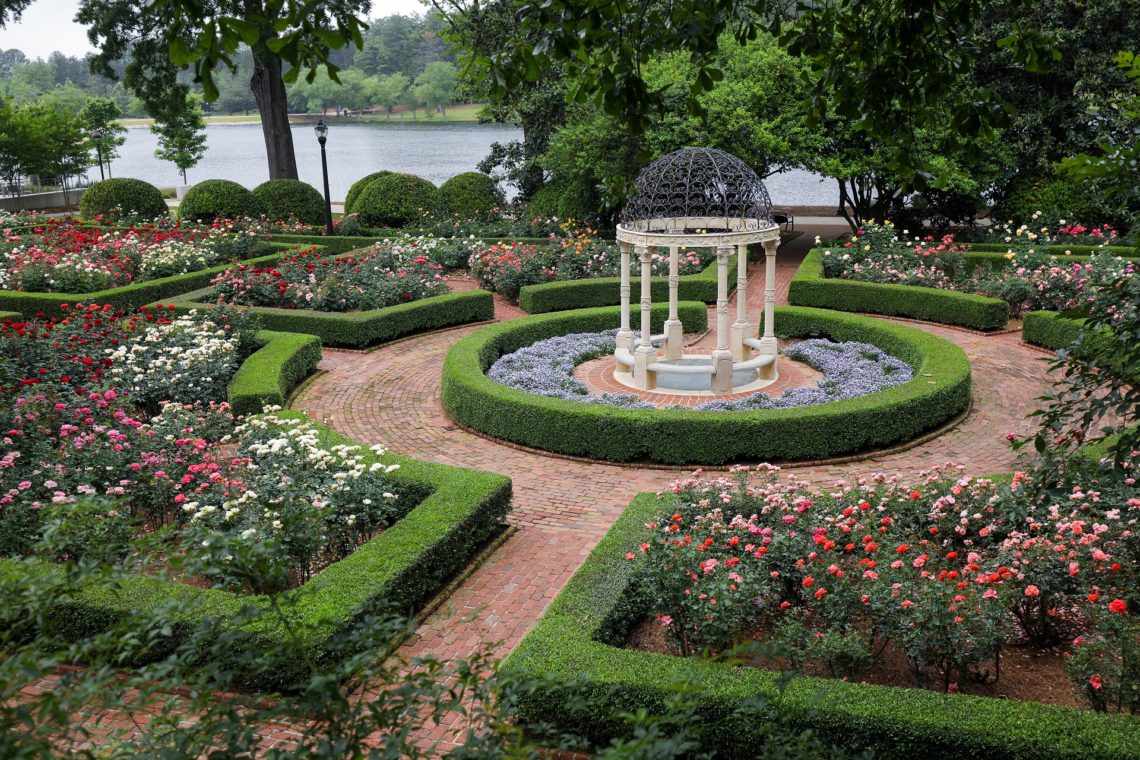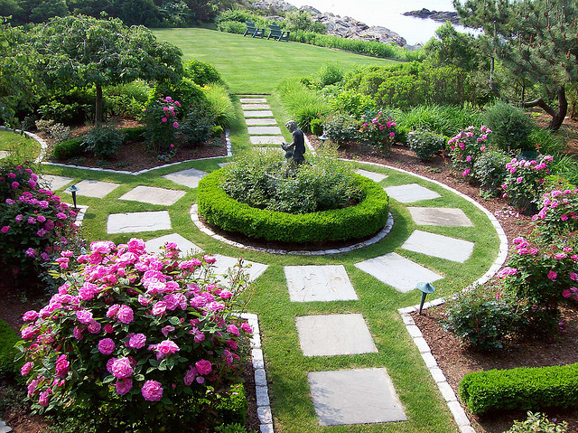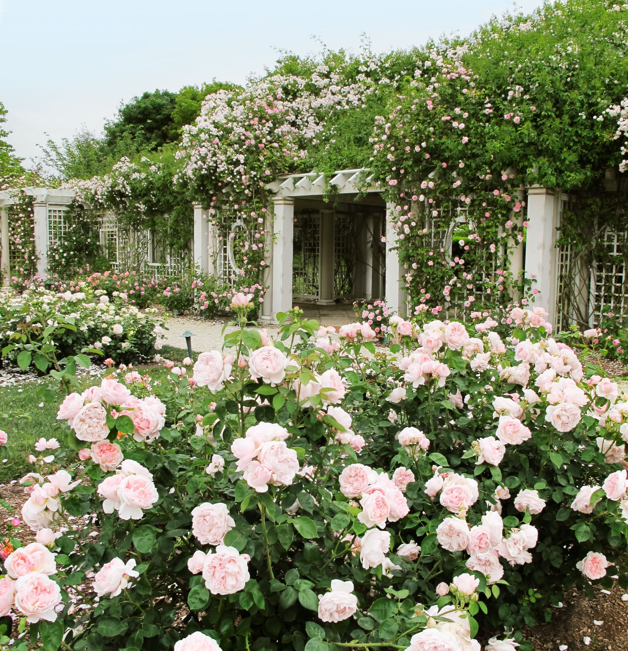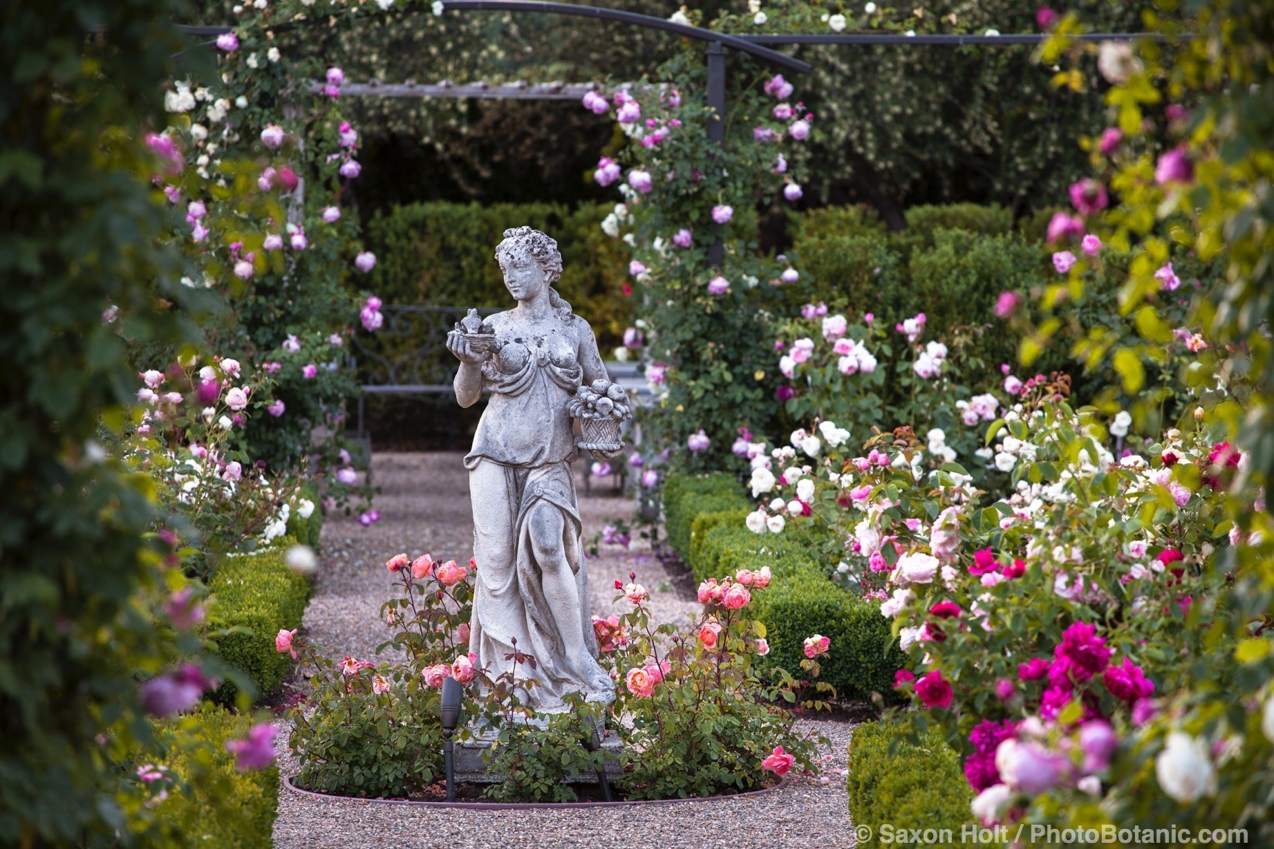 Flowers in this area include a multitude of different roses, including climbing, floribunda, grandiflora, hybrid tea, polyantha, shrub, damask, miniature, and more. They will be organized in waves of colors and separated with boxwood shrubs.
