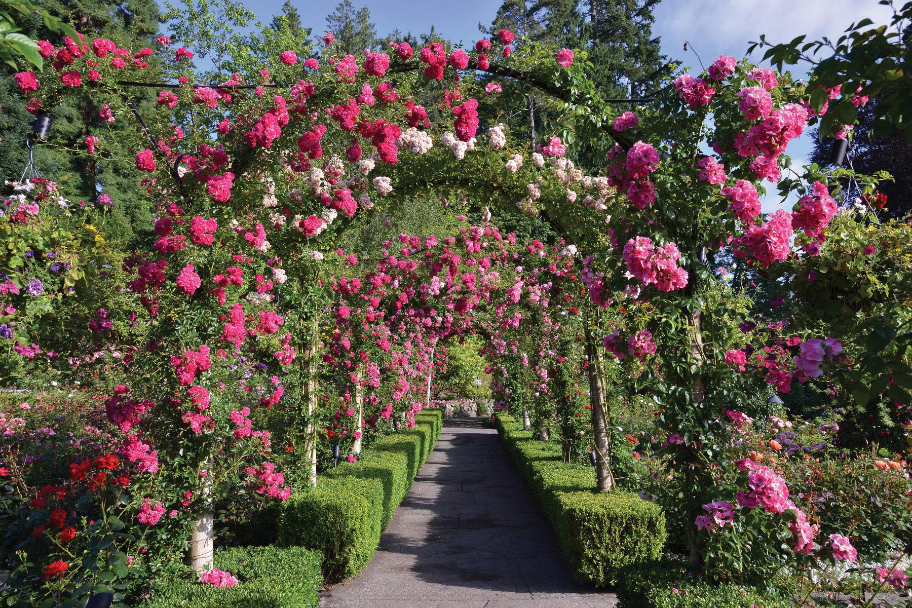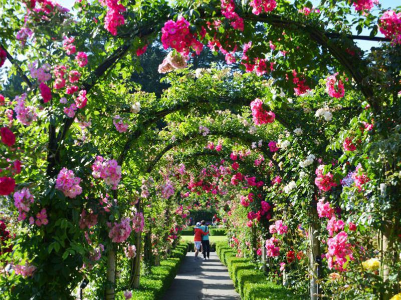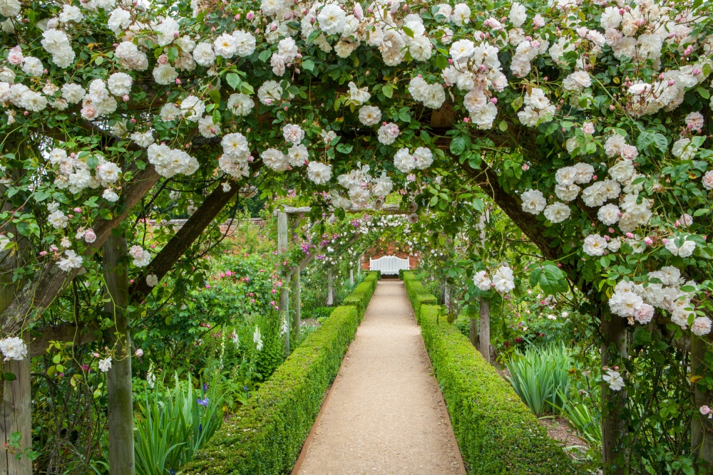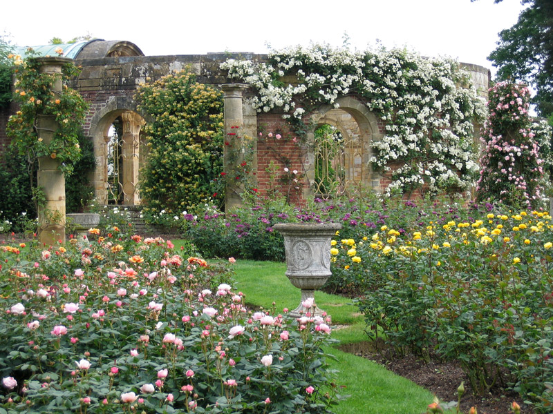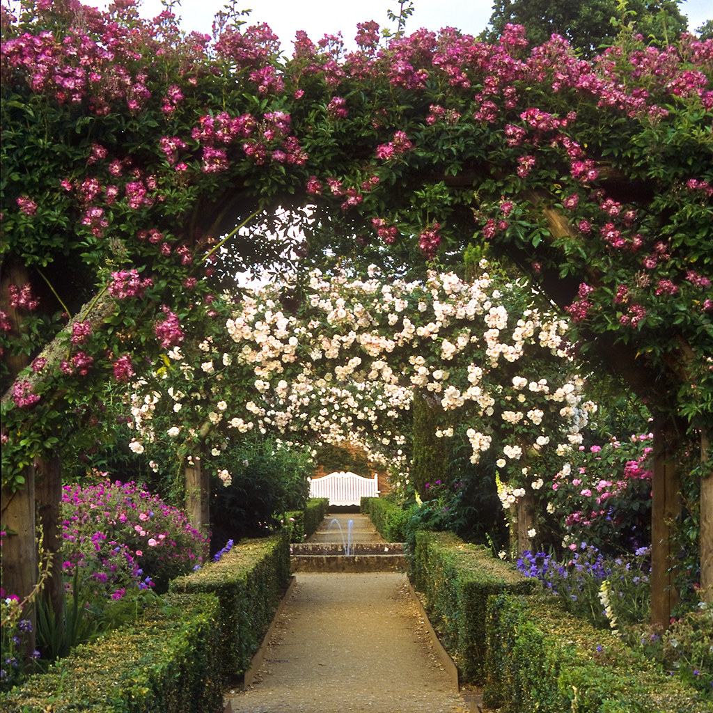 Flowers in this area include a multitude of different roses, including climbing, floribunda, grandiflora, hybrid tea, polyantha, shrub, damask, miniature, and more. They will be organized in waves of colors and separated with boxwood shrubs.